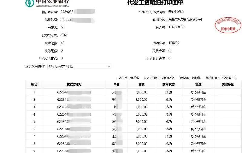 就在他和妻子感到茫然、甚至恐慌的時候,突然收到一條銀行轉賬提醒:遠在東莞的公司為他們分別打賬2000元。