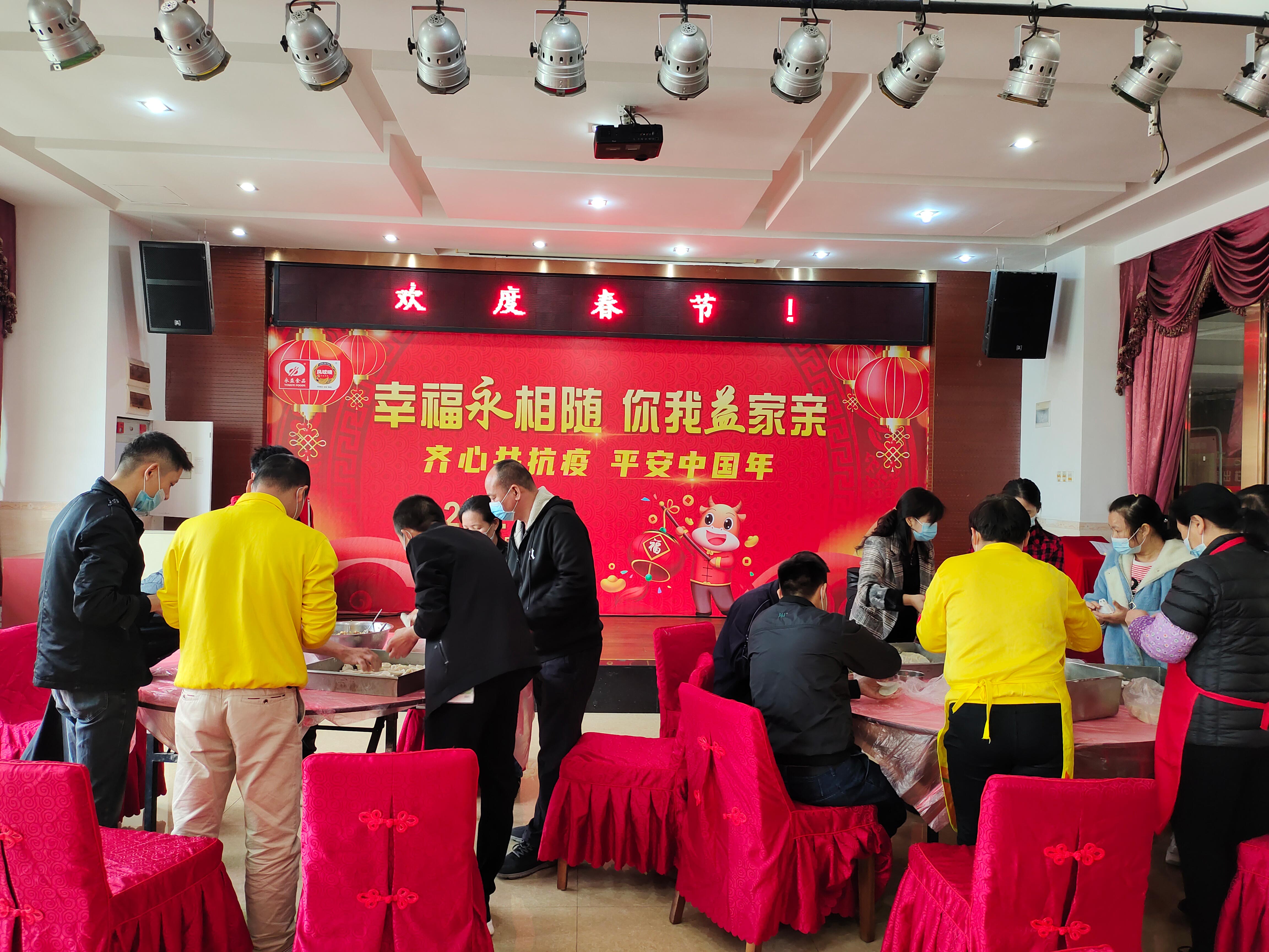 2021年春節,在國內外疫情防控形勢依然嚴峻的情況下,永益食品響應國家號召,大力倡導員工就地過年,不返鄉,不增加旅途中疫情傳播的風險。200多名員工主動選擇留廠過年,300多名員工留東莞過年,這個春節,雖然停下回家過年的腳步,放棄走親訪友的熱鬧,但歡樂祥和的節日氛圍并沒有改變。